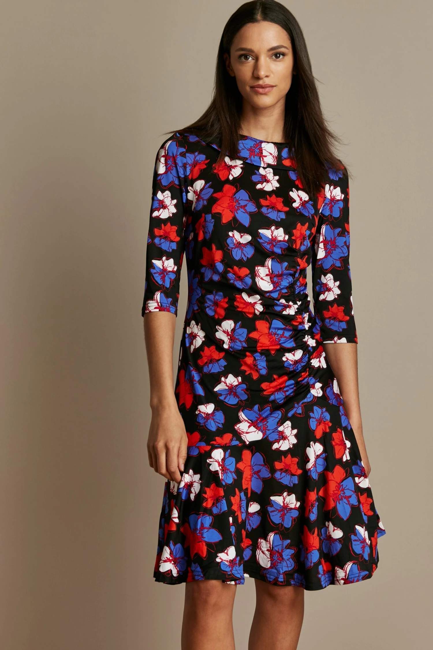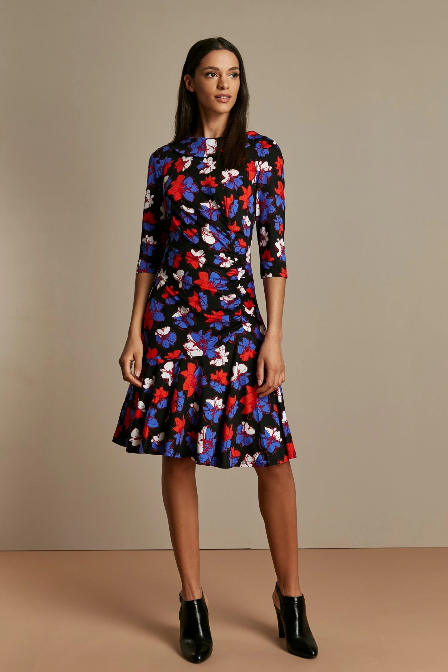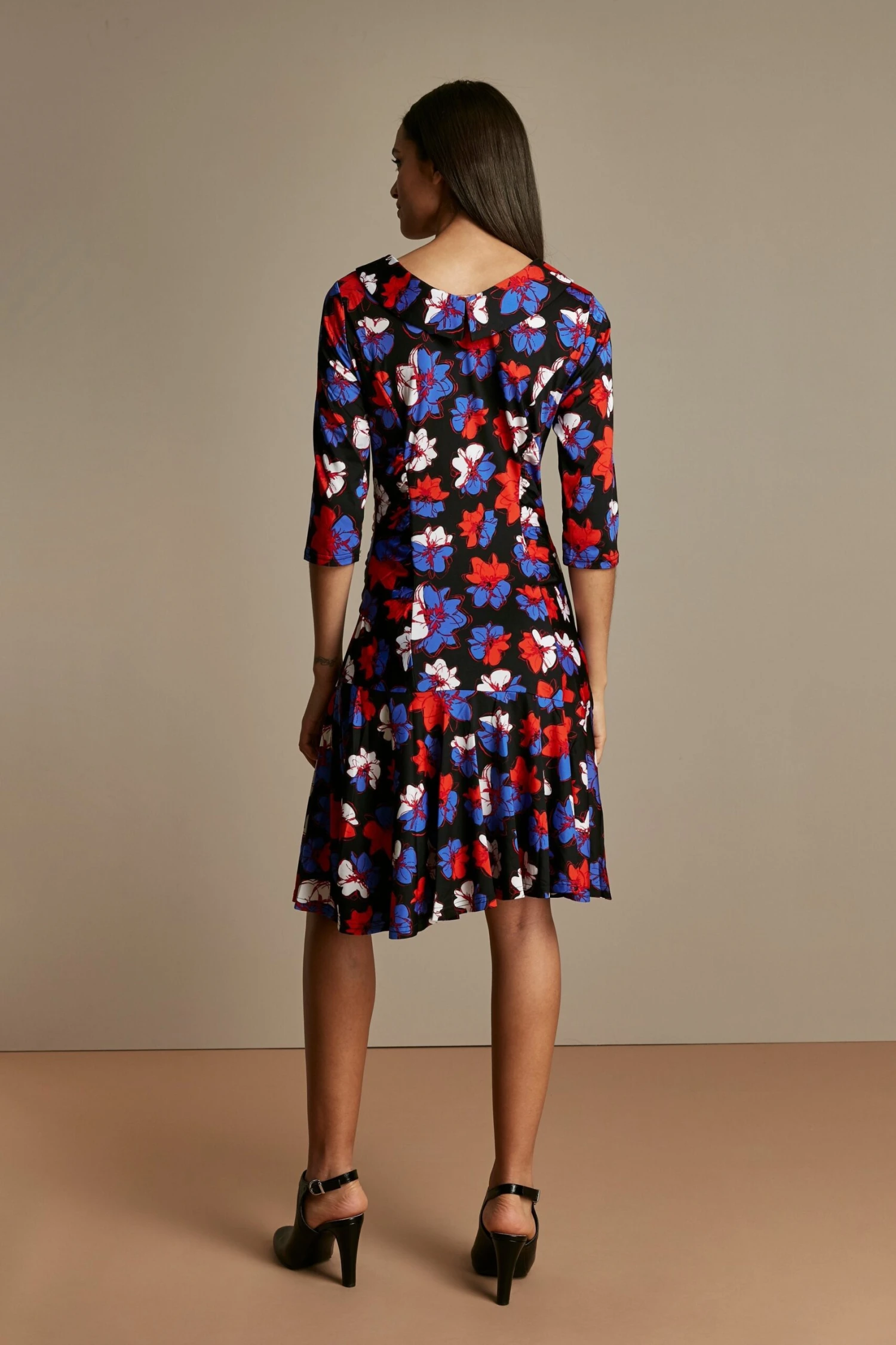 Crafted from a light knitted fabric, this style nips in the waist with a twist for a black floral silhouette. A peplum hemline and an exaggerated roll collar finish the design.