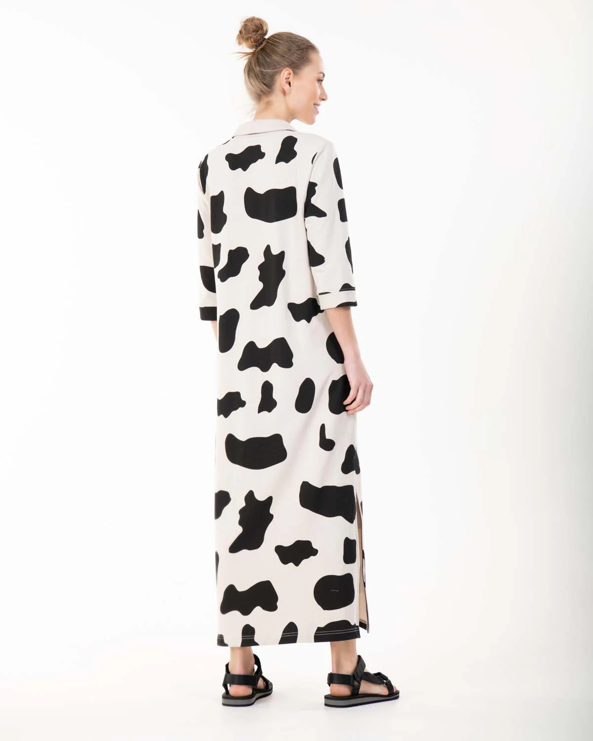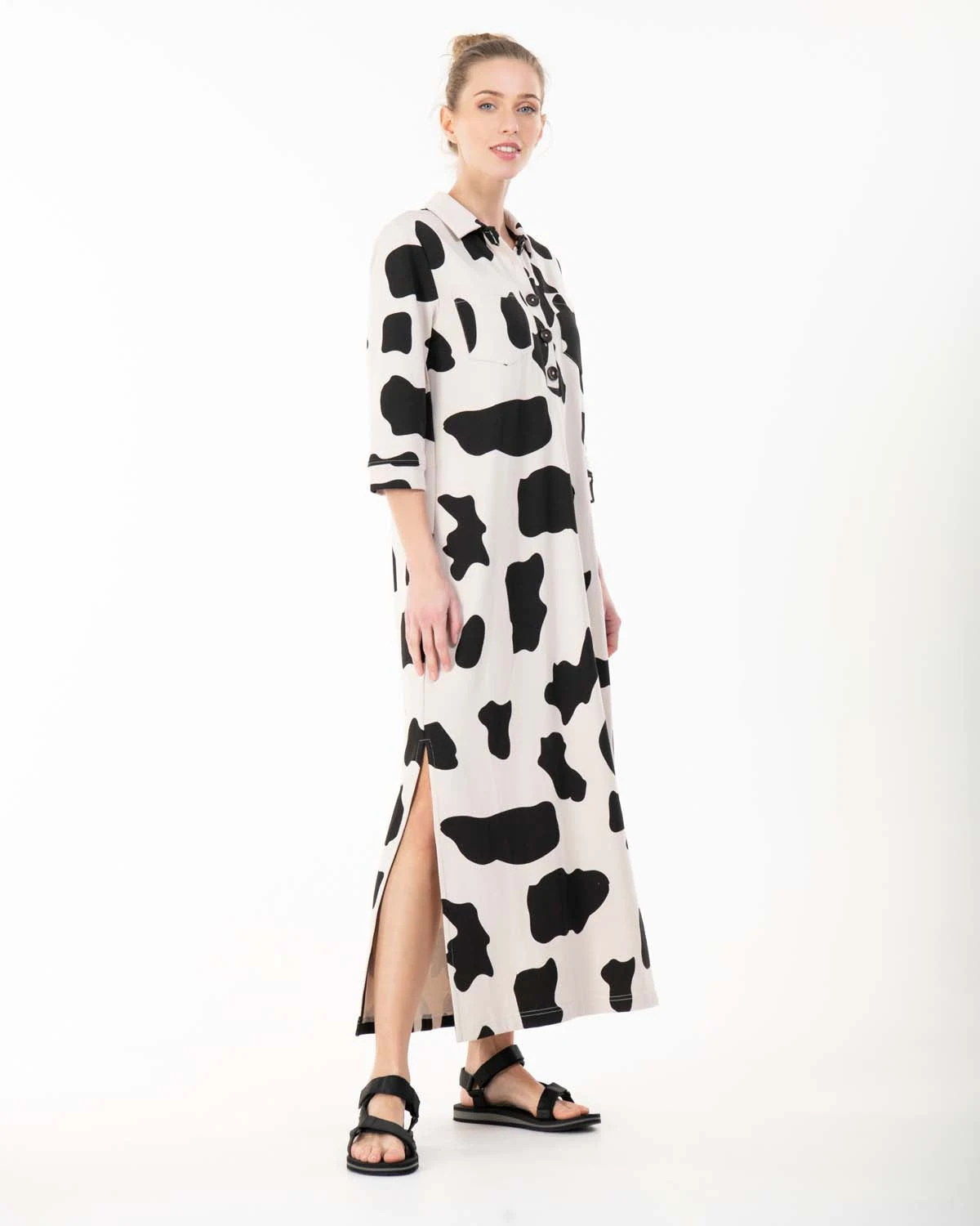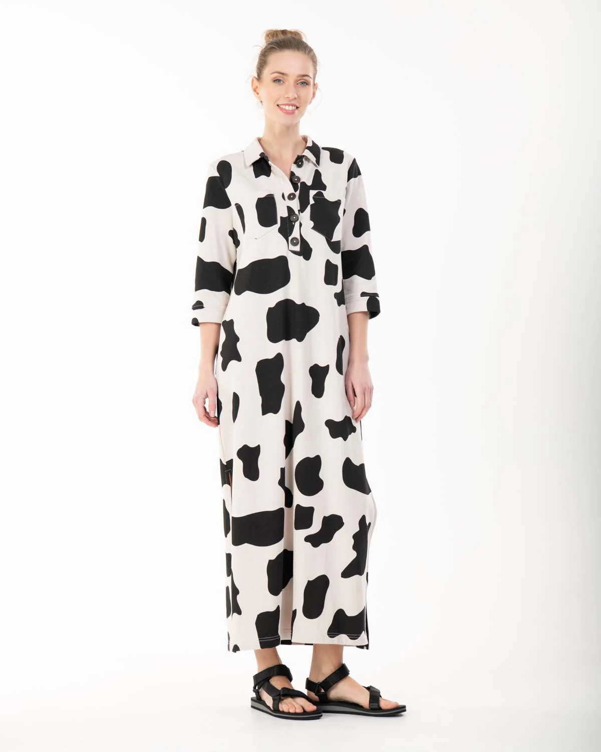Take a look at our gorgeous cow print shirt dress. With a button through detail and at a maxi length. Will fit a size 8-10. This dress is a one-of-a-kind Jolie Moi item.