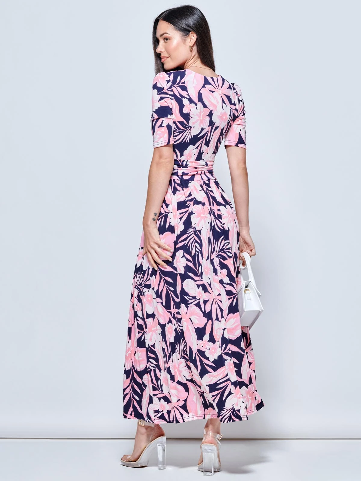 Graceful from top to bottom, the Saniya maxi dress from Jolie Moi is covered in a beautiful daisy floral print. Versatile with its elegant wrap over v-neckline and smart elbow length sleeves, it is completed with functional pockets and a ruched elasticated waistband which draws in your silhouette for a form-flattering fit. The dress is made from our signature non-static and crease proof jersey fabric.