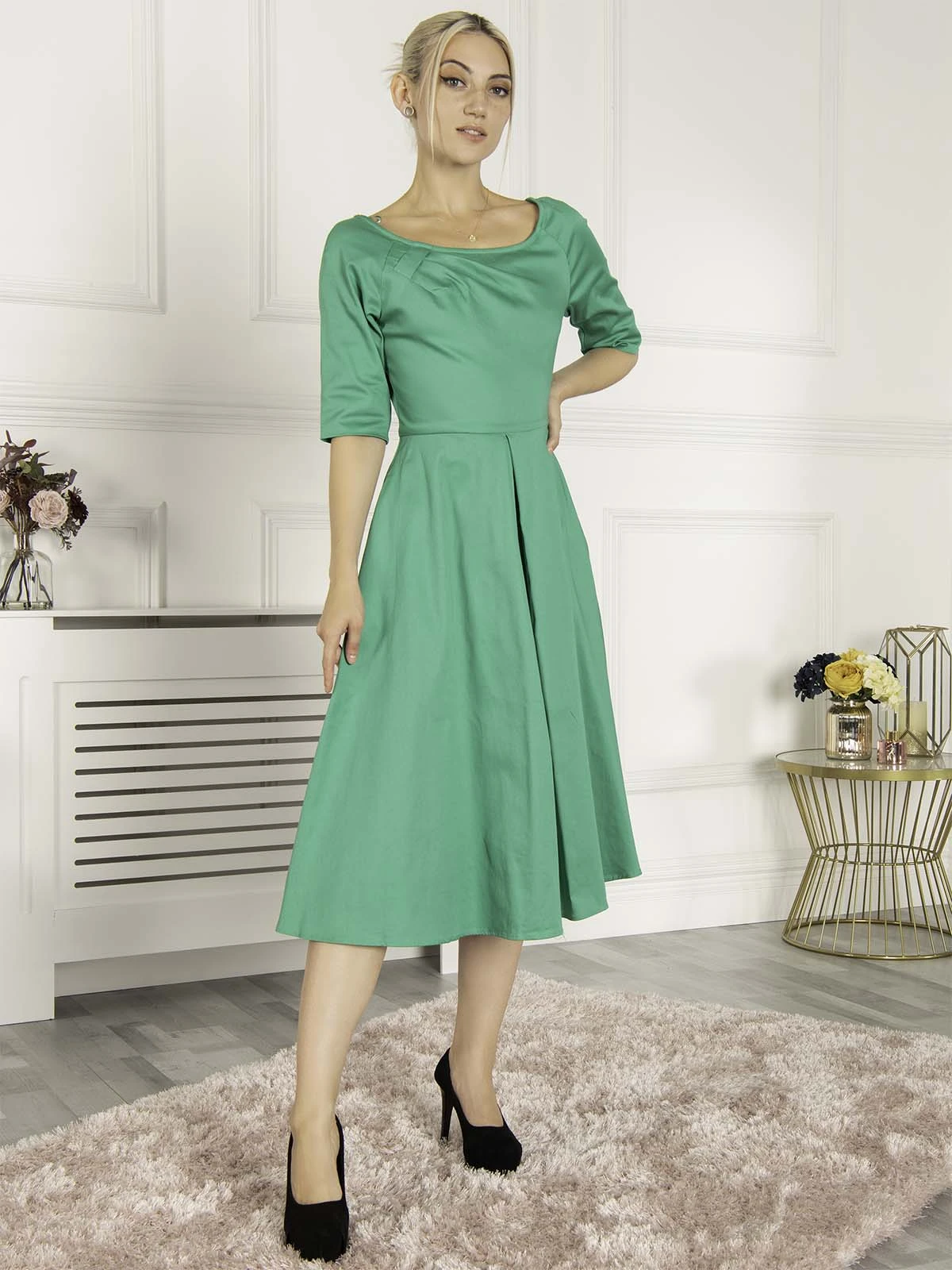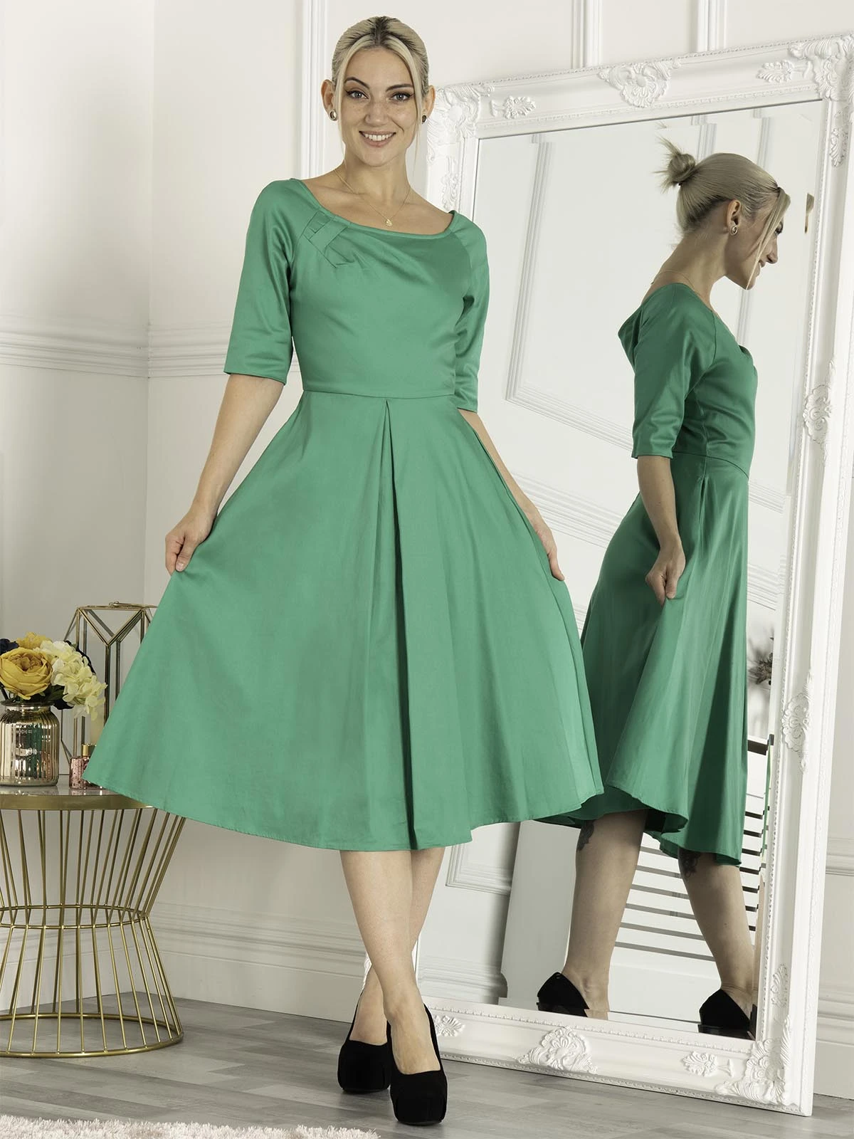 Made from a lightweight cotton-blend and fully lined, this dress takes inspiration from a vintage shape. It is designed with flattering half sleeves, a scoop neckline and a bow detail on the bodice. It fastens with an invisible zip on the back. Team with heels and a clutch for an understated look.