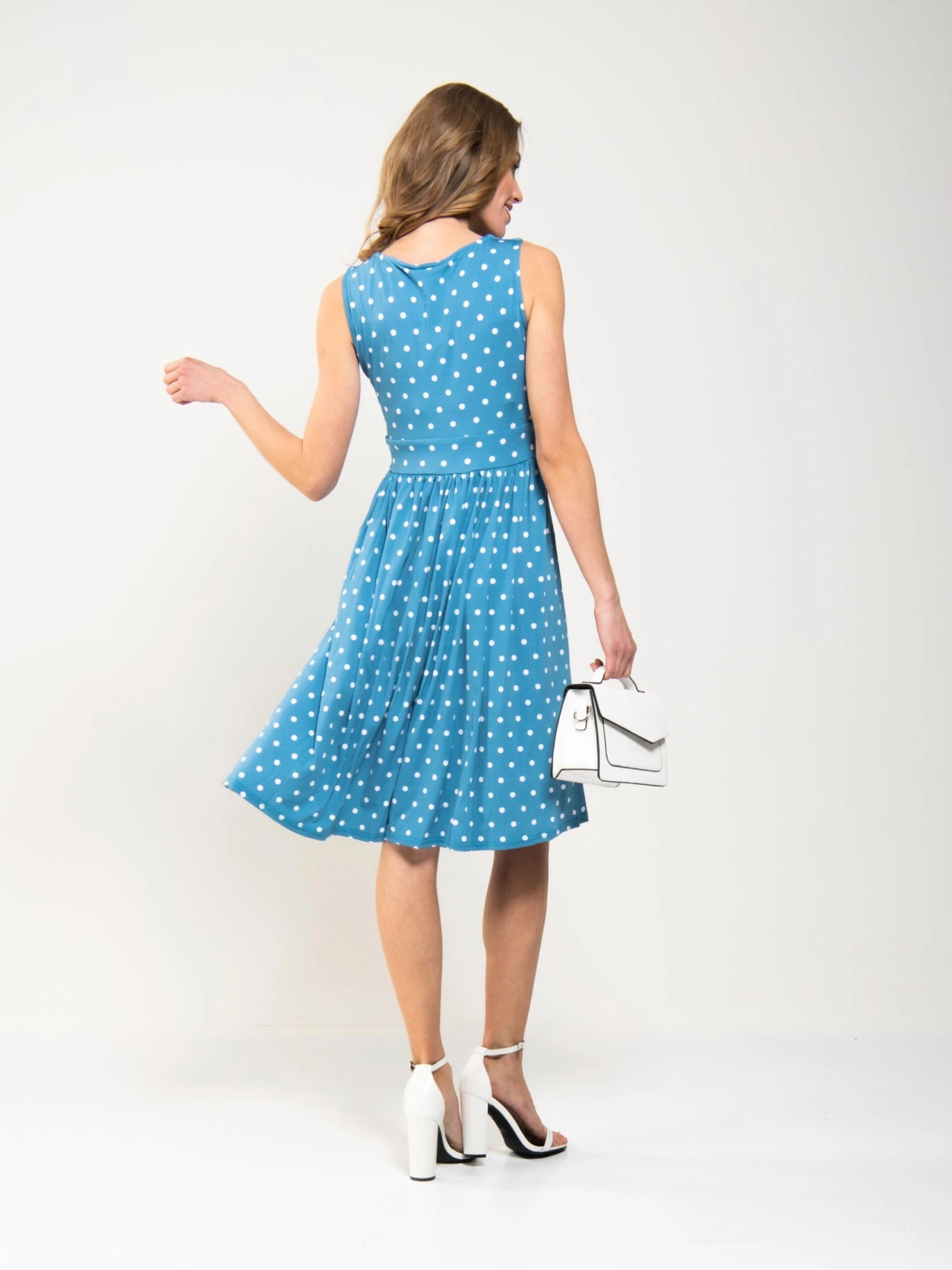 Boasting a vibrant spotty print throughout, this dress from J by Jolie Moi is sure to bring fun to your day. Cut from soft and stretchy jersey for a comfortable fit, this style features a boat neckline with fold detailing, the pockets to the side make for practical wear whilst the pleated skirt give an elegant finish.Â