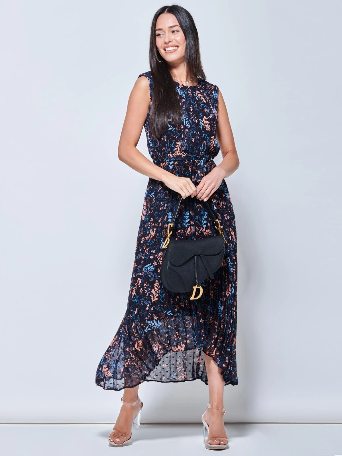 Add a touch of elegance to your wardrobe with this pleated floor-length maxi dress from Jolie Moi. Boasting a floral flourish for added appeal. Complete with a rounded neckline and a sleeveless design, it is a sophisticated option for special occasions.