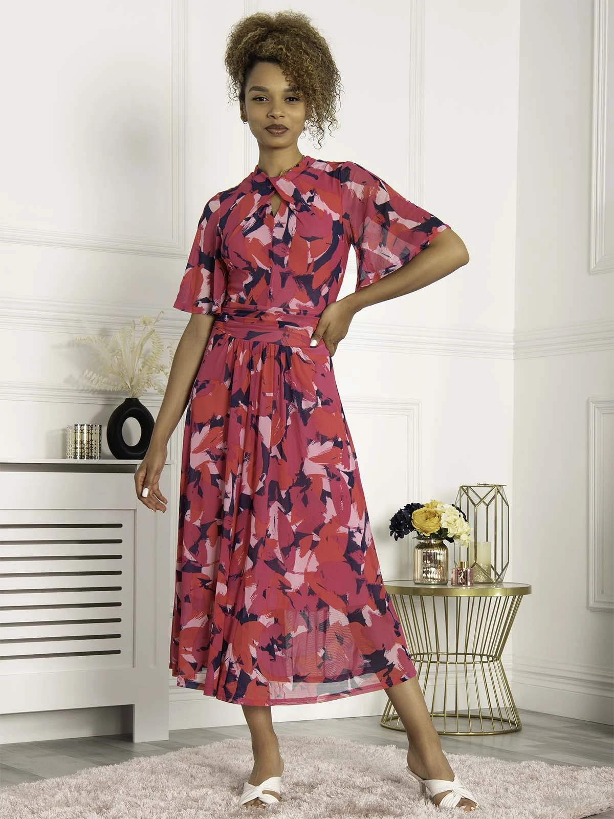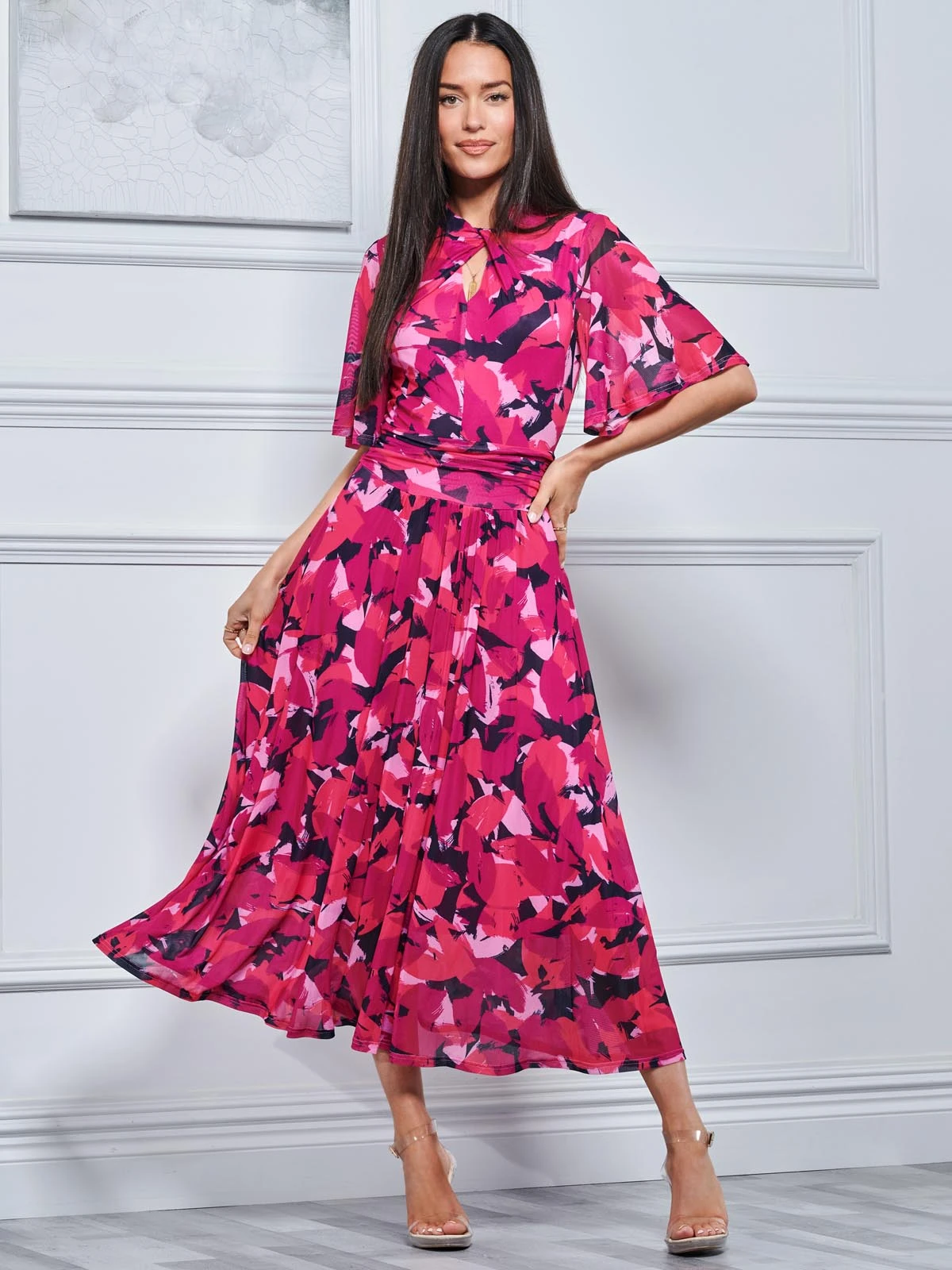 Keep your new season options feeling fresh and distinct from the crowd with this Tina Mesh Dress by Jolie Moi. Doused in an all over floral print, this utterly feminine silhouette is achieved through a turtleneck with a key hole detailing and flared elbow length sleeves add a touch of retro detail. It is made from a soft and fluid mesh fabric and fully lined. Look to team with heeled boots to complete the look.Â