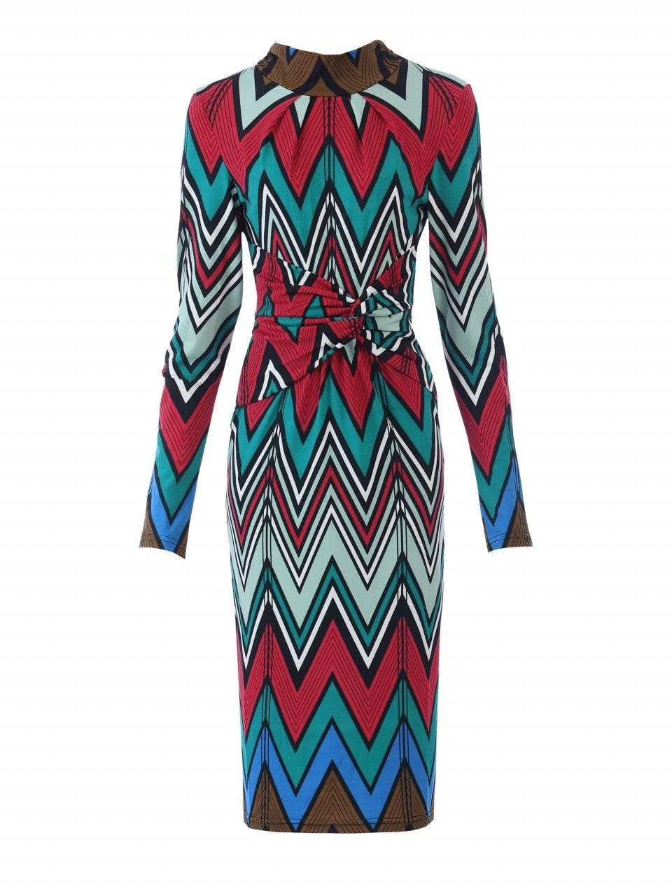 Add unique retro-inspired patterns to your collection with this dress from Jolie Moi. Cut to a midi length for graceful elongation, this fitted style has a high neckline, a twisted front and eye-catching open back back design.