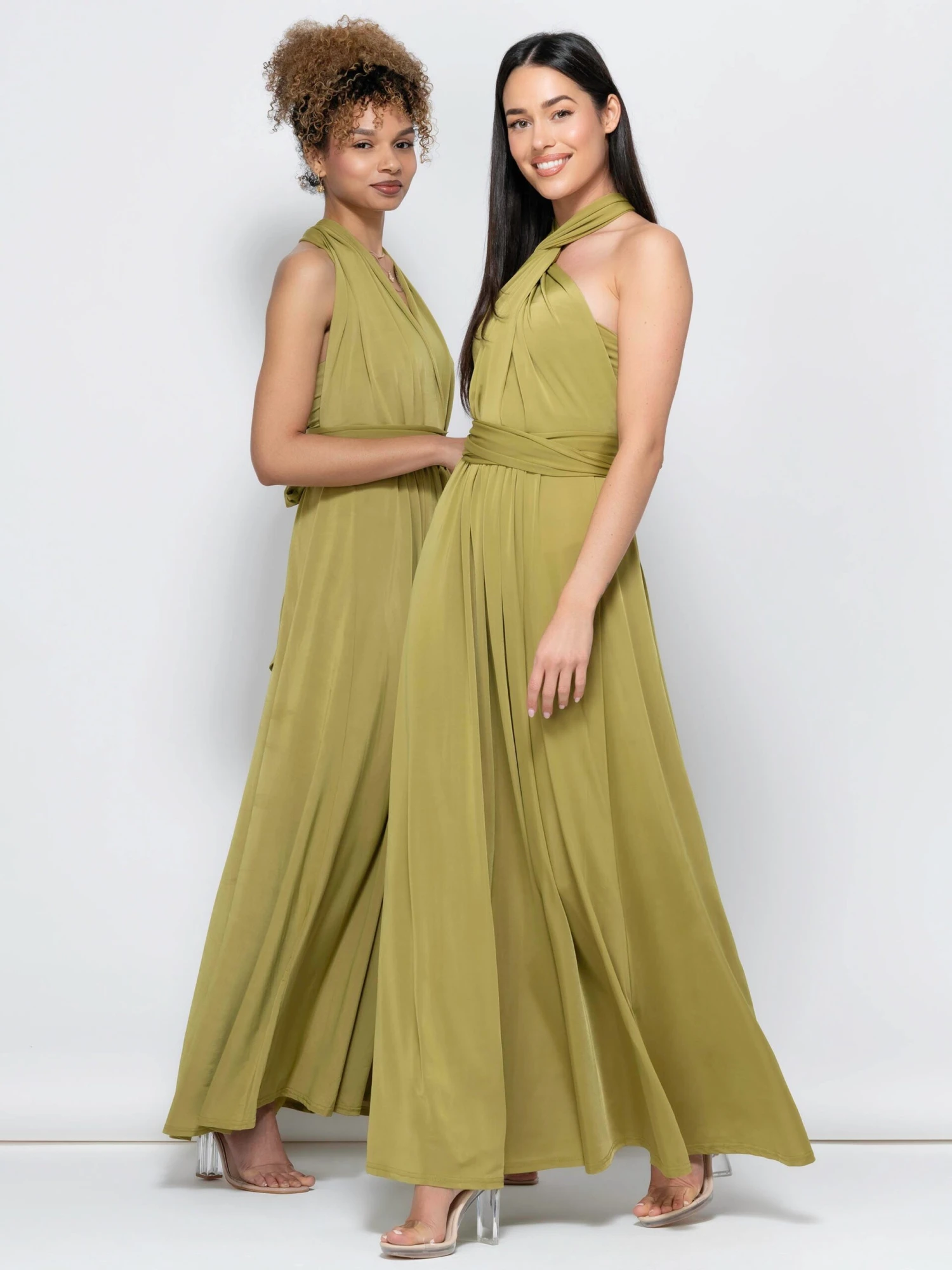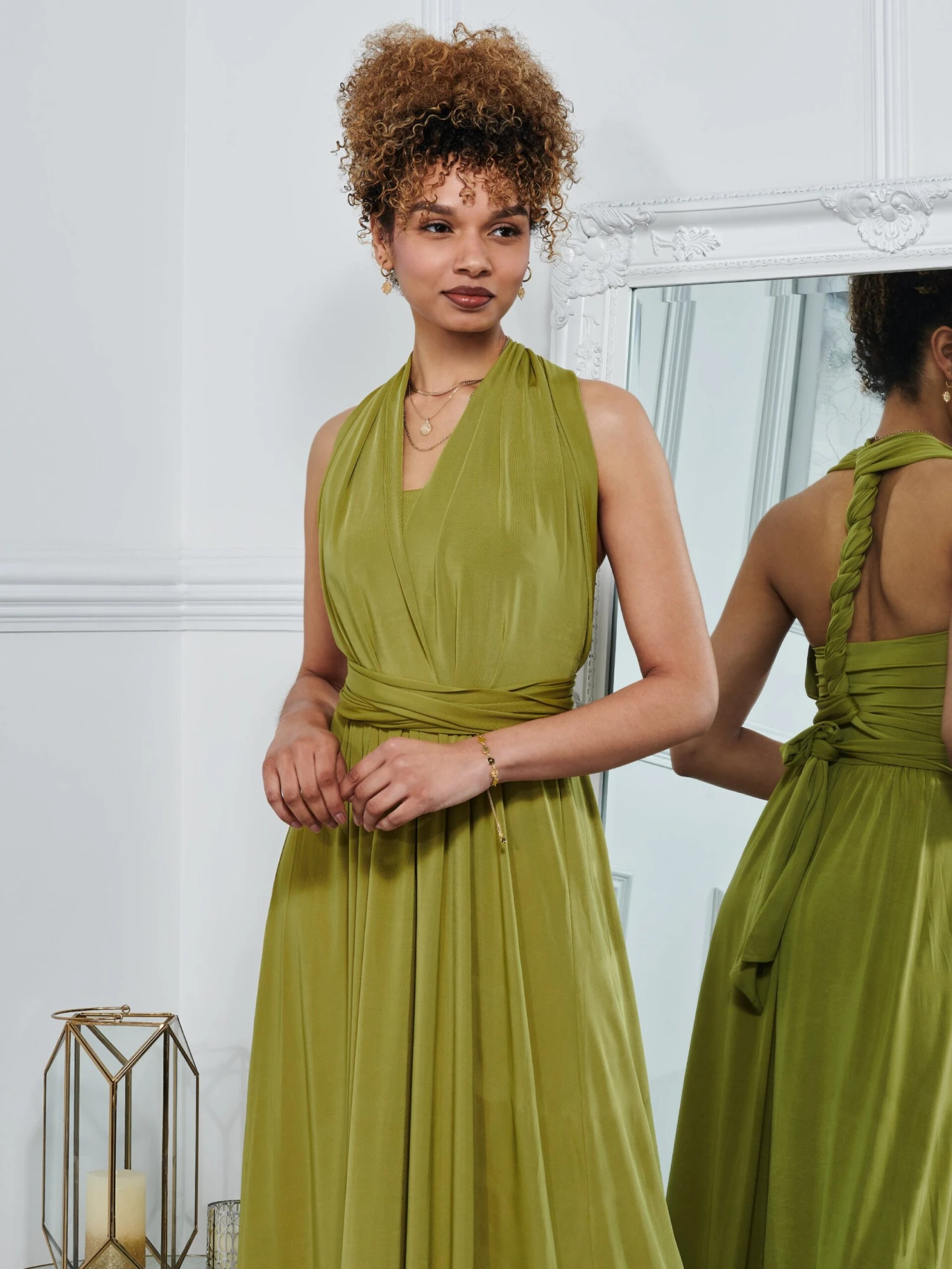 Perfect for a bridesmaid or occasion outfit, this versatile multiway bridesmaid maxi dress with bandeau can be worn in more than fifteen different ways by wrapping /twisting & tying the two front vertical bands, with a number of options to suit and flatter all shapes, sizes and ages while allowing you to express your own personal style! The dress comes with a fitted bandeau top, which can be worn with or without under the bands to give the dress a high back and/or create different looks. The fluid flared maxi skirt falls to the floor in a flattering silhouette, while the hem can be altered easily by a seamstress for the perfect length.