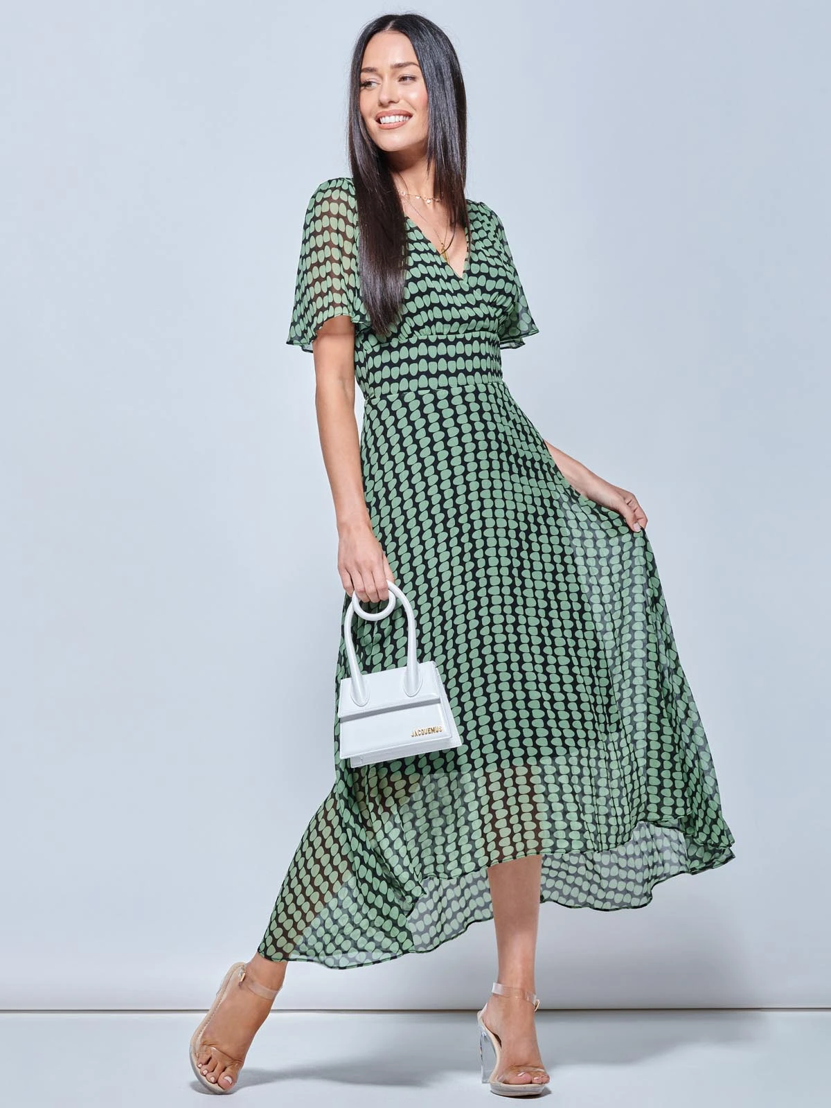 Step into the spot light with this chiffon pleated maxi dress from Jolie Moi. Decorated with a polka dot pattern print. Complimented by a v-neckline, short angel sleeves, and a high-low hemline for added flare. Throw on a pair of strappy heels for an instant ready look.