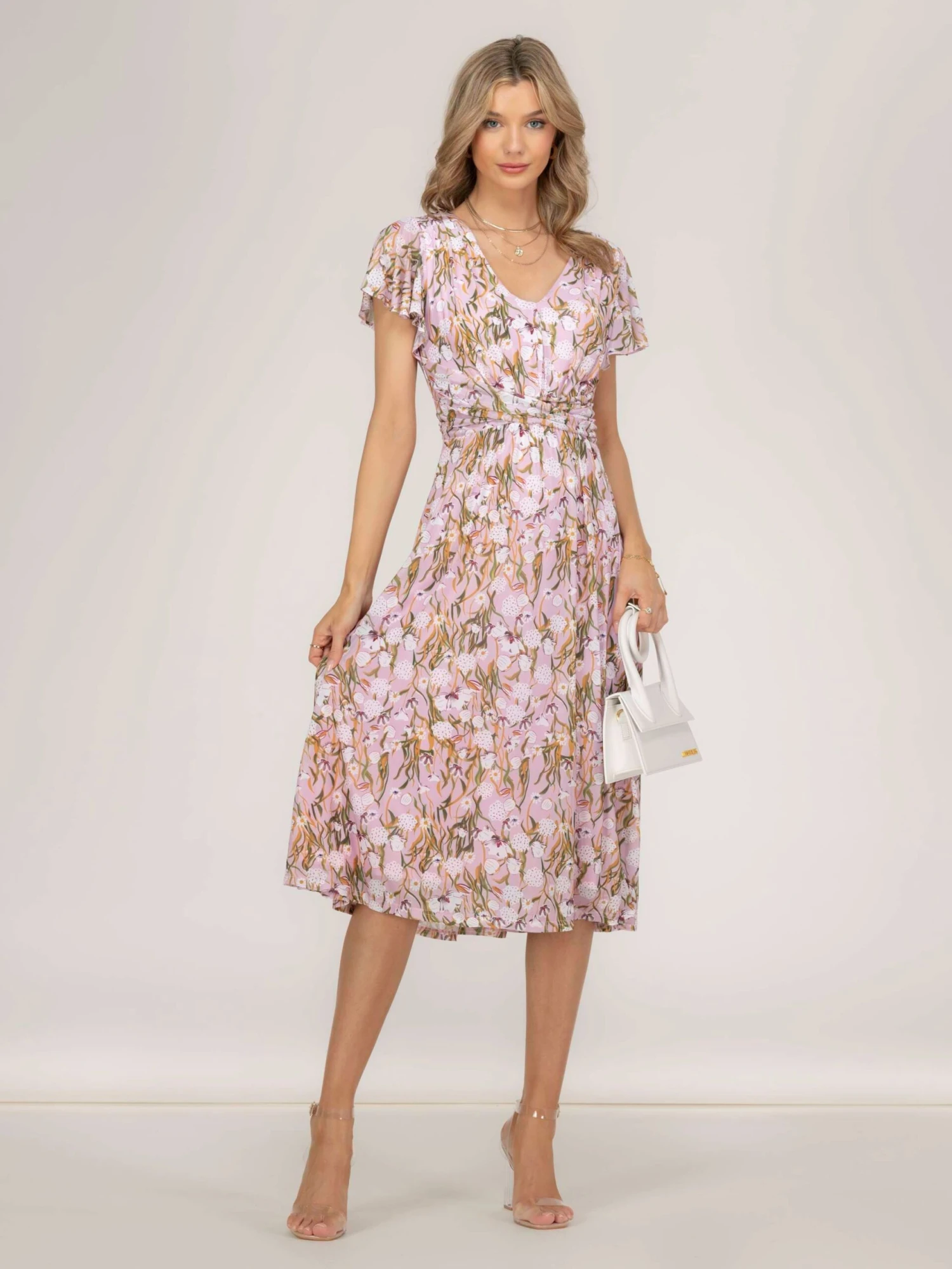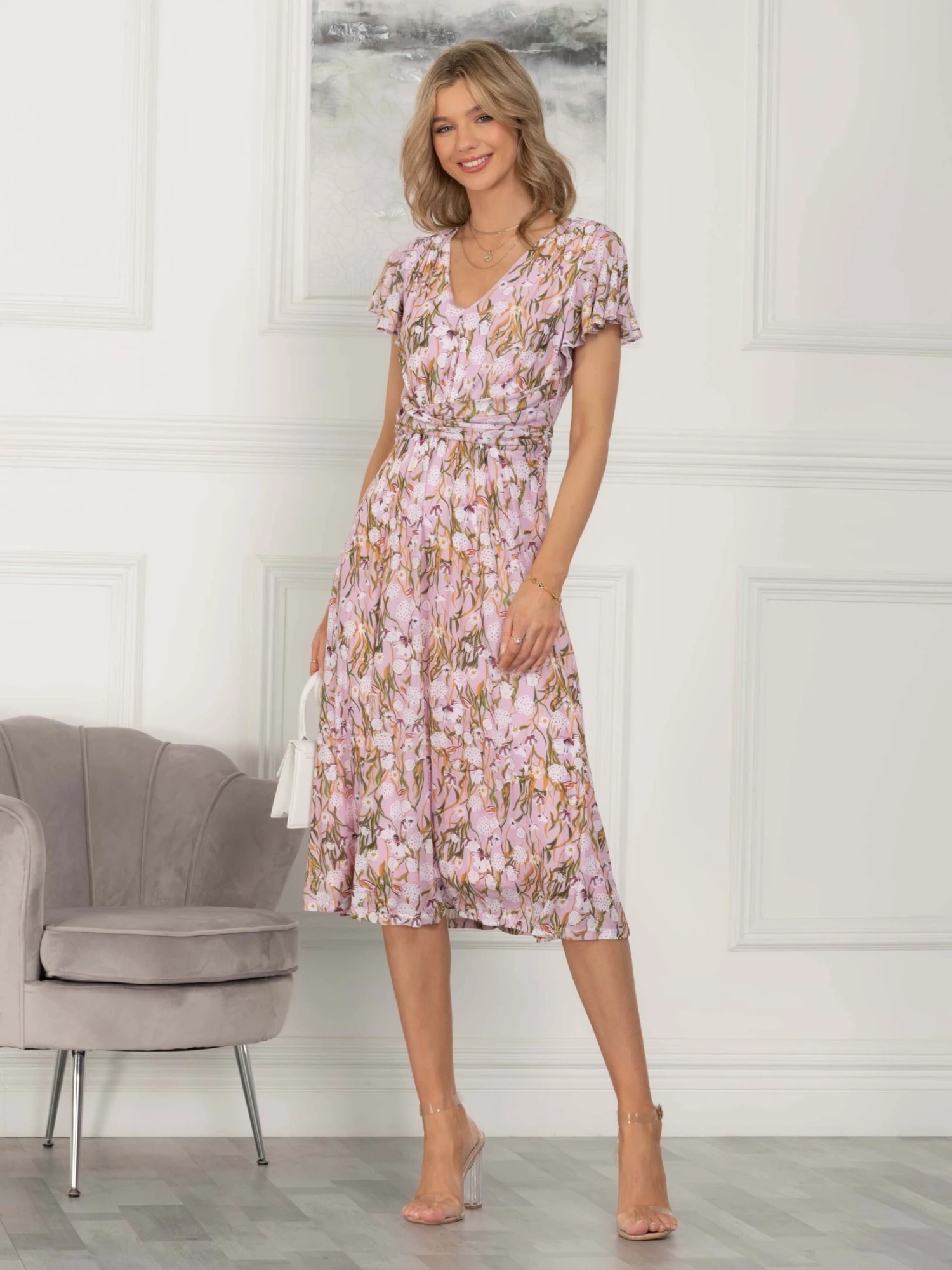 Great for any occasion this floral printed dress from Jolie Moi is fashioned from a lightweight stretch mesh fabric to ensure a comfortable fit. Adorned in a beautiful floral print and finished with a flattering v-neckline and a fit and flare silhouette that falls to a midi length, the body of this dress is fully lined with sheer ruffle cap sleeves. Finish off the look with pin-thin stilettos and a patent clutch.